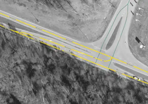 - Om nødvendig bør du derfor rette litt på sideveien slik at den treffer hovedveien med en minste vinkel mellom ca 45 og 90 grader.Dette gjøres f.eks. ved å fjerne noen av de siste nodene i sideveien før veikrysset.
