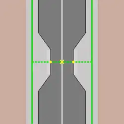 Linien von Gehweg zu Gehweg mit highway=footway+footway=crossingsowiecrossing:island=yesan denjenigen Wegelinien, die über die Mittelinseln führen - Schnittpunkte zwischen Querungslinien und Straßenlinien:
