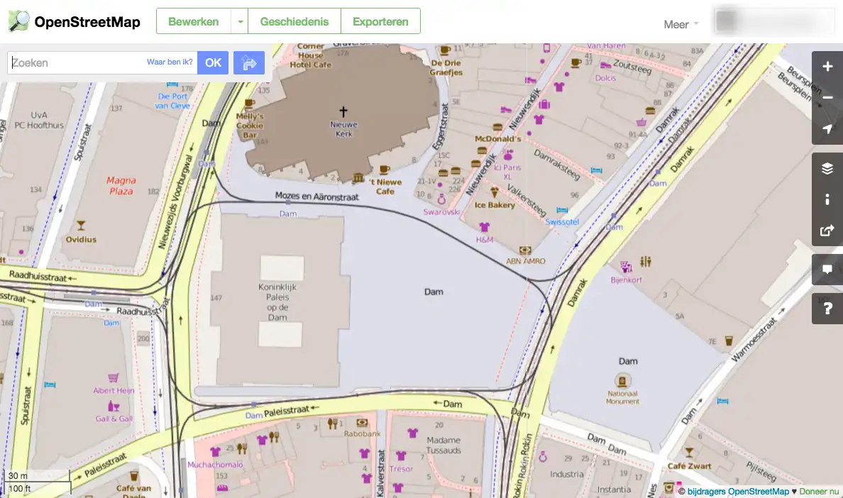 Voor dit voorbeeld en de screenshots gebruik ik onder andere de Dam in Amsterdam als voorbeeld. Ingezoomd tot het hoogste niveau. Ik laat voorbeelden zien in iD en JOSM.