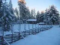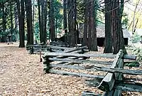 A fence made of wooden or concrete upright posts, with usually three horizontal wooden rails, to which vertical wooden boards are fastened. | |