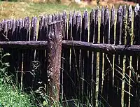 A variety of fences, usually consisting of either vertical posts tied together with wire, or vertical boards nailed to horizontal braces. |