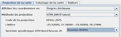 Celle-ci concerne l'île de la Réunion qui est passée de l'ancienne projection "Gauss Laborde Réunion" à l'UTM (zone 40 sud) en janvier 2010. Il faut d'abord choisir comme méthode de projection "UTM 20N (France)" et dans la liste déroulante Système Géodésique, spécifier "Réunion RGR92" (note : le titre "UTM 20N (France)" n'est plus approprié puisqu'il regroupe des zones UTM différentes et devra être corrigé dans JOSM).