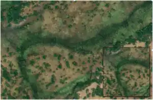 Berge | Si une berge est visible sur l'imagerie satellite, elle doit être cartographiée comme un polygone. Une ligne pour la voie waterway=river doit être dessinée à l'intérieur de la berge comme indiqué sur la photo.