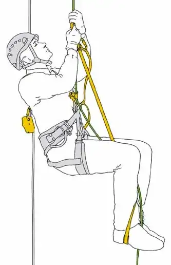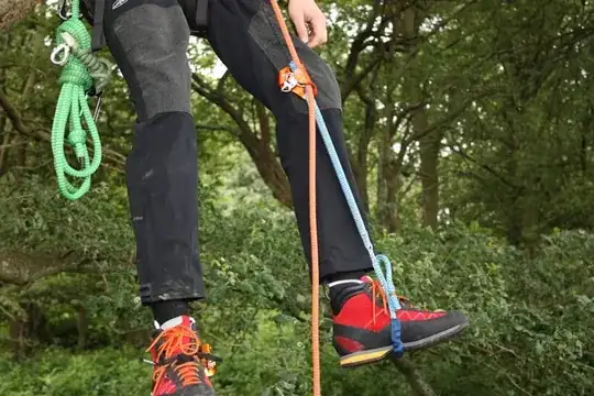 - Sit in your harness (possible because the device auto-blocks) and slide the friction knot upwards. Repeat until you reach the top of the rope.