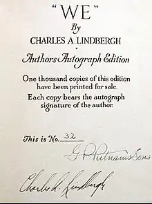 "WE" was officially published little more than a week later on July 27 and within six weeks it had sold over 190,000 copies at $2.50 apiece while a special limited edition of 1,000 numbered autographed copies also sold out quickly at $25 each.[1][5][10] Soon translated into most major world languages, "WE" remained at the top of best-seller lists well into 1928. With dozens of printings and more than 650,000 copies sold in the first year, "WE" earned Lindbergh more than $250,000 in royalties.[5] The book's great commercial success was considerably aided by its publication coinciding with the start of his three-month tour of the United States in the Spirit on behalf of the Daniel Guggenheim Fund for the Promotion of Aeronautics. The nation became obsessed with Lindbergh during the tour in which he was seen in person by more than 30 million Americans, a quarter of the nation's then population. No other author before or since ever had such an extensive, highly publicized tour that helped promote a book than did Lindbergh's "We" of himself and the Spirit during their 22,350-mile, July 20 to October 23, 1927 tour of the U.S., visiting 82 cities in all 48 states during which the nation's nascent aviation superhero delivered 147 speeches and rode 1,290 mi (2,080 km) in parades.[5][N 3]