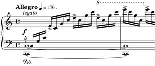 The main technical difficulty of this piece is playing the uninterrupted right hand arpeggios, including the swift position changes, in legato powerfully and accurately at the suggested tempo (quarter note = 176) without straining the hand. The momentum of the motion has to be transferred by the outer hand and the fifth finger to the accentuated top notes. French pianist Alfred Cortot (1877–1962) states that the first difficulty to overcome is "stretch and firmness in shifting the hand over nearly the whole length of the keyboard."[13] Exercises introduced by Cortot, Gottfried Galston[14] and Alfredo Casella[15] deal mostly with stretch and anticipation of position changes. Ferruccio Busoni in his Klavierübung introduces an exercise for two hands in contrary motion, somewhat reminiscent of Leopold Godowsky.[16] Australian pianist Alan Kogosowski warns against straining the right hand by constant overstretching. To avoid strain, the first note of the position "must be released like a hot potato," and the hand "should move quickly and laterally, without stretching, from the first note to the next note and the next position."[17]