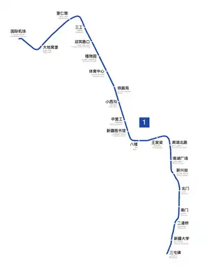 Line 1 runs from Ürümqi Diwopu International Airport through downtown Ürümqi and ends at Santunbei station. It has a total length of 27.615 km[1] and 21 stations.[1][3] It is fully underground.[4]