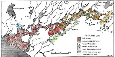 The Great Þjórsá Lava (Icelandic: Þjórsárhraunið mikla [ˈθjour̥sˌaur̥ˌr̥œyːnɪð ˈmɪhkla]) is the largest lava flow in Iceland (by both area and volume) and the largest lava that is known to have erupted in a single eruption in the Holocene. It belongs to a group of lavas known as the Tungnaá lavas. It was erupted in the Veiðivötn region, Central Iceland, 8600 years BP (6600 BC). The crater area is covered by younger lavas and eruptives. The Þjórsá Lava does not appear on the surface until 70 km downstream of its supposed crater area.