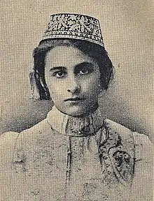 Şefiqa Gaspıralı (Russian: Шефика Исмаиловна Гаспринская, romanized: Shefika Ismailovna Gasprinskaya; 14 October 1886 – 31 August 1975) was a Crimean Tatar feminist leader who was editor-in-chief and publisher of the first women's magazine, a member of the Presidency Council of the Kurultai, and a deputy for two terms in the Crimean People's Republic. She was also a kindergarten teacher.