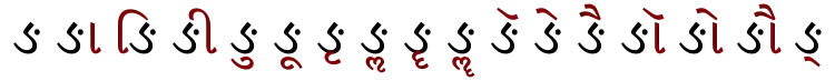 | ङ | ङा | ङि | ङी | ङु | ङू | ङृ | ङॄ | ङॢ | ङॣ | ङे | ङै | ङो | ङौ | ङ् |