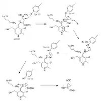 The structure of ACS has been largely determined via X-ray crystallography.[12] Conservation of the residues in ACS's catalytic domain and sequence homology suggest that ACS catalyzes the synthesis of ACC in a similar fashion as other enzymes that require PLP as a cofactor. However, unlike many other PLP-dependent enzymes, Lys (278) is not the only residue that interacts with the substrate. The proximity of the electronegative oxygen from Tyr (152) to the C-γ-S bond suggests a crucial role in the formation of ACC.[13] X-ray crystallography with aminoethoxyvinylglycine (AVG) a competitive inhibitor confirmed Tyrosine's role in the γ elimination.[14]