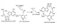 However, it is also inhibited by a number of compounds as well. S-Adenosylethionine can bind as a substrate for ACC synthase (with higher affinity than SAM) and therefore inhibit any reaction with SAM. ACC Synthase is also competitively inhibited by aminoethoxyvinylglycine (AVG) and aminooxyacetic acid (AOA), inhibitors to many pyridoxal phosphate-mediated enzymic reactions. They are natural toxins that cause slow binding inhibition by interfering with the coenzyme pyridoxal phosphate. ACC synthase activity is also inhibited by intermediates of the activated methyl cycle and the methionine-recycling pathway: 5′-methylthioadenosine, α-keto-γ-methylthiobutyric acid, and S-adenosylhomocysteine.[8][9][10]