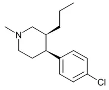 1-Methyl-3-propyl-4-(p-chlorophenyl)piperidine is a drug developed by a team led by Alan Kozikowski, which acts as a potent dopamine reuptake inhibitor, and was developed as a potential therapeutic agent for the treatment of cocaine addiction.[1] As with related compounds such as nocaine, it is a structurally simplified derivative of related phenyltropane compounds.[2] Its activity at the serotonin and noradrenaline transporters has not been published, though most related 4-phenylpiperidine derivatives are relatively selective for inhibiting dopamine reuptake over the other monoamine neurotransmitters. While several of its isomers are active, the (3S,4S)-enantiomer is by far the most potent.[3][4] The rearranged structural isomer 2-[1-(4-chlorophenyl)butyl]piperidine is also a potent inhibitor of dopamine reuptake.[5]