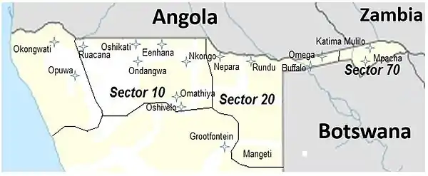 The South West Africa Territory Force, SWATF[2] renumbered battalion numbers according to their geographical positioning on the border. The prefix 10 pertained to battalions operating to the west of the Kavango River, 20 to the Kavango or central region and 70 to the eastern region. Under this system, 35 Battalion was renamed 101 Battalion in 1980.