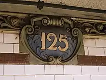 The original decorative scheme consists of blue tile station-name tablets, pink tile bands, a green terracotta cornice, and dark blue terracotta plaques.[33]: 42 The mosaic tiles at all original IRT stations were manufactured by the American Encaustic Tile Company, which subcontracted the installations at each station.[33]: 31 The decorative work was performed by tile contractor Manhattan Glass Tile Company and terracotta contractor Atlantic Terra Cotta Company.[33]: 42 Many of the original name tablets have since been replaced with newer renditions, but most of the plaques remain intact.