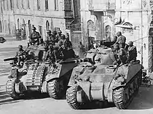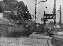 After achieving a breakout from the Anzio beachhead, 1st Armored Division tanks were positioned just south of Rome by 2 June 1944. Allied planners wanted to waste no time, and immediately ordered the tanks of the 13th Armored Regiment to advance to the "Eternal City." LTC Cairns' 3rd Battalion 13th Armor, part of Task Force Howze, led the way down Highway 6.[10] Despite sporadic enemy resistance, the retreating Germans could not stop the rapid advance. Meanwhile, on 3 June, the bulk of the 1st Armored Division advanced up Highway 7, with 1-13 and 2-13 Armor in Combat Command B (CCB). Allied units from across Italy were in a rush to be the first to enter Rome. The morning of 4 June 1944 began as a race. A Co, 1-13 Armor was sent ahead as a flying column while the rest of CCB broke into three columns advancing down parallel roads along Highway 7 to bypass Allied traffic and German defenses. TF Howze, to the east of the city, ran into strong German resistance just outside of city limits. By 0615, its 3rd Battalion, 13th Armor broke through and continued down Highway 6; eager infantrymen holding onto the backs of the fast-moving tanks. By 0715, H Co, 3-13 Armor, under CPT John A. Beale, became the first American element to enter the Eternal city; The lead tank was commanded by SGT Chester Abner.[10] However, after turning a corner, his tank and another were both hit by anti-tank gun fire; the Germans weren't going to give up so easily.[10] For hours, TF Howze battled with German roadblocks in the city, slowly clearing the streets. Companies G, H, and I rolled to the northwest to cut off a German armored counterattack. After his tank was disabled, LTC Cairns, commanding 3-13 Armor, took command of CPT Beale's tank, resulting in the odd scenario where a Company Commander acted as the gunner for his Battalion Commander. Together, the two commanders found and knocked out several enemy vehicles.[10]