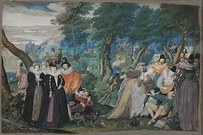 The bodices of French, Spanish, and English styles were stiffened into a cone or flattened, triangular shape ending in a V at the front of the woman's waist. Italian fashion uniquely featured a broad U-shape rather than a V.[14] Spanish women also wore boned, heavy corsets known as "Spanish bodies" that compressed the torso into a smaller but equally geometric cone.[23] Bodices could be high-necked or have a broad, low, square neckline, often with a slight arch at the front early in the period. They fastened with hooks in front or were laced at the side-back seam. High-necked bodices styled like men's doublets might fasten with hooks or buttons. Italian and German fashion retained the front-laced bodice of the previous period, with the ties laced in parallel rows.
