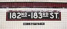 The 182nd–183rd Streets station is a local station on the IND Concourse Line of the New York City Subway. It is served by D train at all times except rush hours in the peak direction and the B train during rush hours.
