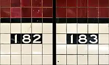 Both platforms have a Claret red trim line with a black border and mosaic name tablets reading "182ND-183RD ST." in white sans-serif lettering on a black background with a Claret red border. Below the trim line are tile captions in white lettering on a black background showing "182" in the south half of the station and "183" in the north half, similar to the arrangement at the 174th–175th Streets station. There are also directional tile captions below the name tablet mosaics.