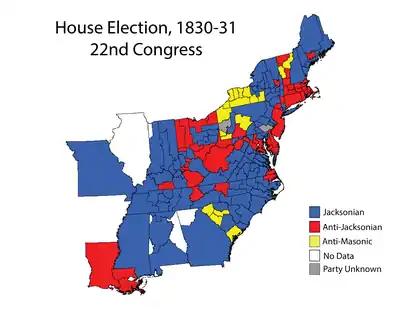 The 1830 United States elections occurred in the middle of Democratic President Andrew Jackson's first term, during the Second Party System. Members of the 22nd United States Congress were chosen in this election. The election saw Jackson's Democrats retain control of both chambers of Congress over the National Republicans and other members of the anti-Jackson faction, while the Nullifier Party won seats in Congress for the first time.