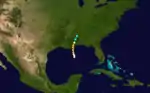 The ship Orphan encountered a hurricane with winds of 80 mph (130 km/h) in the central Gulf of Mexico on September 15.[4] It strengthened quickly while moving northward, becoming a Category 2 hurricane later that day. By 0000 UTC on September 16, the storm peaked as a Category 3 hurricane with maximum sustained winds of 125 mph (200 km/h), making it the strongest tropical cyclone of the season. Shortly thereafter, the hurricane made landfall near Buras-Triumph, Louisiana at the same intensity. It weakened after moving inland, decreasing to Category 1 intensity later on September 16. Early on the following day, the system weakened to a tropical storm, several hours before dissipating over central Alabama.[2]