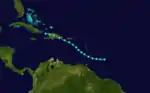 Based on reports of a strong gale, a tropical storm was first tracked about 250 miles (400 km) east-southeast of Barbados early on August 24.[1] It initially headed westward, before re-curving west-northwestward early on the following day. Shortly thereafter, the storm passed through the Windward Islands between Grenada and Saint Vincent and the Grenadines. The storm peaked with winds of 70 mph (115 km/h) while moving northwestward across the Caribbean Sea. It weakened slightly before making landfall near San Pedro de Macorís, Dominican Republic with winds of 60 mph (95 km/h) early on August 27. The storm slowly weakened over Hispaniola and was last noted near Bombardopolis, Haiti later that day.[2]