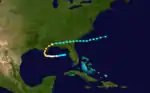 The first known storm of the season—which would also become the strongest—is listed in the hurricane database as having formed on August 8 in the eastern Gulf of Mexico, just offshore the west coast of the Florida peninsula, although it is possible the hurricane was related to a heavy gale encountered by a ship on August 5 during its voyage from Havana to New York City. The cyclone drifted southwest for three days, gradually intensifying to attain a strength corresponding to Category 3 major hurricane status on the modern-day Saffir-Simpson Hurricane Scale. Beginning on August 11, the hurricane slowly curved to the north, then gained an easterly component to its movement, and was at its peak intensity with maximum sustained winds of 125 mph (201 km/h) about midday.[1][4]