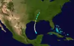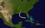 A hurricane in the middle of September affected some of the same areas along the northern coast of the Gulf of Mexico as the August hurricane. It was first detected on the evening of September 10 in the southeastern Gulf, although its track may be far off from the actual storms movement due to a lack of available information. Its first data point in the hurricane database lists it as possessing sustained winds of 100 mph (160 km/h), placing it at Category 2 intensity on the Saffir-Simpson Hurricane Scale.[1] The storm followed a broad northward curve through the central Gulf of Mexico, making landfall along the Mississippi River Delta of Louisiana on the night of September 14.[10] It continued toward the north-northeast, dissipating on September 16.[1]