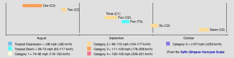The 1860 Atlantic hurricane season featured three severe hurricanes that struck Louisiana and the Gulf Coast of the United States within a period of seven weeks. The season effectively began on August 8 with the formation of a tropical cyclone in the eastern Gulf of Mexico, and produced seven known tropical storms and hurricanes until the dissipation of the last known system on October 24. Six of the seven storms were strong enough to be considered hurricanes on the modern-day Saffir–Simpson Hurricane Scale, of which four attained Category 2 status and one attained Category 3 major hurricane strength. The first hurricane was the strongest in both winds and pressure, with peak winds of 125 miles per hour (201 km/h) and a barometric pressure of 950 millibars (28 inHg). Until contemporary reanalysis discovered four previously unknown tropical cyclones that did not affect land, only three hurricanes were known to have existed; all three made landfall in Louisiana, causing severe damage.