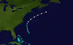 The final tropical cyclone of the season was observed by the Santa Martha early on October 22,[2] while located about 355 mi (570 km) east-northeast of the Abaco Islands.[4] Based on reports from several ships,[2] it quickly moved northward and intensified into a Category 1 hurricane by midday on October 23. Around that time, the hurricane peaked with maximum sustained winds of 80 mph (130 km/h). The storm moved rapidly east-northeastward and was last noted about 180 mi (290 km) south-southwest of Sable Island late on October 24.[4]