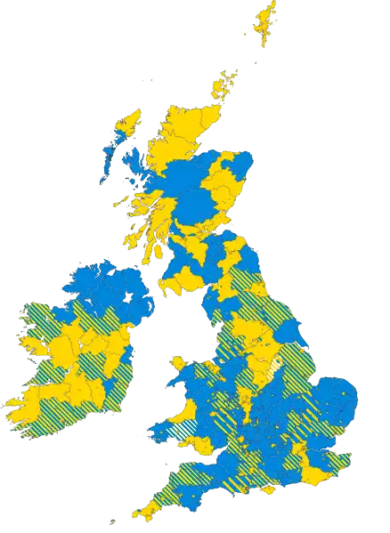 Colours denote the winning party—as shown in § Results