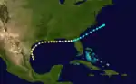 Late on October 2, a hurricane formed in the Gulf of Mexico, off the coast of northeastern Mexico. Holding its intensity, the storm system paralleled the Texas coastline, causing "many" deaths. A storm tide value of 7 feet (2.1 m) was reported in Ludlum (1963), and it is possible that Brownsville, Texas, was in the western eyewall of the hurricane at the storms closest approach.[3] Turning towards Louisiana, the storm made landfall on the state with winds of 100 mph (160 km/h), a Category 2 on the Saffir-Simpson hurricane scale. Moving to the east and weakening, the storm made landfall on the state of Florida during the day on October 6. Holding its strength while crossing the Sunshine state, the tropical storm re-emerged into Atlantic waters. Taking a slight turn to the north, it dissipated off the coast of North Carolina on October 9.[5]