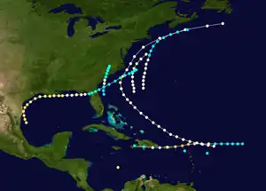 The 1867 Atlantic hurricane season lasted from mid-summer to late-fall. A total of nine known tropical systems developed during the season, with the earliest forming on June 21, and the last dissipating on October 31. On two occasions during the season, two tropical cyclones simultaneously existed with one another; the first time on August 2, and the second on October 9. Records show that 1867 featured two tropical storms, six hurricanes and one major hurricane (Category 3+). However, in the absence of modern satellite and other remote-sensing technologies, only storms that affected populated land areas or encountered ships at sea were recorded, so the actual total could be higher. An undercount bias of zero to six tropical cyclones per year between 1851 and 1885 and zero to four per year between 1886 and 1910 has been estimated.[1] Of the known 1867 cyclones Hurricanes Three, Four and Six plus Tropical Cyclones Five and Eight were first documented in 1995 by Jose Fernandez-Partagas and Henry Diaz.[2] Hurricane One was first identified in 2003 by Cary Mock.[3]