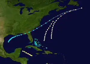 The first known tropical cyclone of the season was observed on September 3, about halfway between the Bahamas and Bermuda.[1] A nearby ship estimated winds of 80 mph (130 km), indicating the presence of the hurricane.[4] It moved northward initially, passing about 220 mi (350 km) west of Bermuda on September 4. Thereafter, the hurricane turned toward the northeast,[1] and the ship "John Richardson" encountered gale force winds on September 5, resulting in a wreck of its cargo.[2] On September 6, it was estimated to have reached peak winds of 105 mph (169 km/h), based on observations from the ship with the call sign "Greenock".[4] The hurricane lashed the ship with strong winds for 14 hours, killing the captain and one crewman. At the time, it was about 400 mi (640 km) southeast of Halifax, Nova Scotia.[2] Turning to the northeast, the hurricane passed south of Newfoundland before last being observed on September 7.[1]
