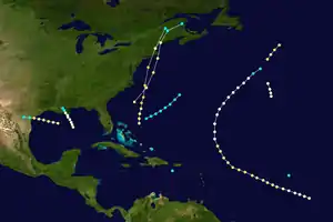 The 1869 Atlantic hurricane season was the earliest season in the Atlantic hurricane database in which there were at least ten tropical cyclones.[1] Initially there were only three known storms in the year, but additional research uncovered the additional storms.[2] Meteorologist Christopher Landsea estimates up to six storms may remain missing from the official database for each season in this era, due to small tropical cyclone size, sparse ship reports, and relatively unpopulated coastlines.[3] All activity occurred in a three-month period between the middle of August and early October.