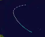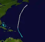 On September 9, a tropical storm was observed east of the Lesser Antilles. Over the following two days, it moved slowly north-northwestward through the islands, before reaching hurricane status on September 12. It turned more toward the north, and passed east of Bermuda on September 15. It was last observed on September 19.[4]