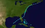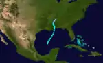 The Atlantic hurricane database begins the track for this system as a tropical storm about 140 mi (230 km) north of the Yucatán Peninsula early on October 22. Intensifying slightly as it moved northeastward across the Gulf of Mexico, the storm reached winds of 60 mph (95 km/h) prior to making landfall near Clearwater, Florida, around 08:00 UTC on October 23. About 10 hours later, the cyclone emerged into the Atlantic just north of Cape Canaveral and then curved north-northeastward. After briefly reaching hurricane intensity on October 24, the system made landfall near Topsail Beach, North Carolina, early on October 25 with winds of 60 mph (95 km/h). The storm then moved north-northeastward to northeastward across the Northeastern United States before emerging into the Gulf of Maine on October 27 and becoming extratropical. The extratropical system then dissipated just offshore Nova Scotia on the following day.[5]