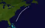 The schooner Pilot's Pride first encountered this hurricane northeast of the Bahamas on October 7.[4] The system moved just west of due north and intensified into a Category 2 hurricane on the following day. Based on ship reports, the hurricane is estimated to have peaked with maximum sustained winds of 105 mph (165 km/h).[5] The bark Marie was damaged by the storm on October 8 and returned to port for repairs.[4] Early on October 9, the cyclone curved northeastward and weakened to a Category 1 hurricane. The storm was last noted to the southeast of Sable Island late on October 10.[5]