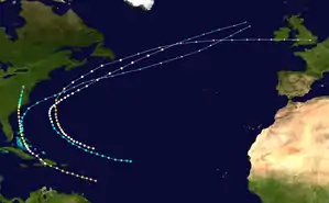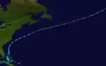 A tropical storm was first seen on August 18 in the tropical Atlantic. It moved to the west-northwest, becoming a hurricane before turning to the northeast. It moved past Newfoundland on August 26.[2] The hurricane caused 80 deaths from swells in the Newfoundland area.[3]