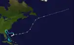 The first storm of the season was spotted by the steamship State of Nebraska, while located about midway between Bermuda and Sable Island at 00:00 UTC on September 1. Initially, sustained winds of 80 mph (130 km/h) were observed, equivalent to a Category 1 hurricane.[3] Later on September 1, the bark Engelbert lost spars and sail to the east of Sable Island. Additionally, the Naupactus encountered heavy seas and lost a portion of its deckload.[4] Early on September 2, the hurricane weakened to a tropical storm. Shortly thereafter, it made landfall in southeastern Newfoundland. Accelerating northeastward, the storm transitioned into an extratropical cyclone around 00:00 UTC on September 3, while located about 460 mi (740 km) northeast of St. John's, Newfoundland and Labrador. The extratropical remnants moved east-northeastward across the Atlantic and struck Ireland, before dissipating late on September 6.[3] This hurricane was added to HURDAT based on a study by Jose F. Partagas and Henry F. Diaz in 1996.[4][3]