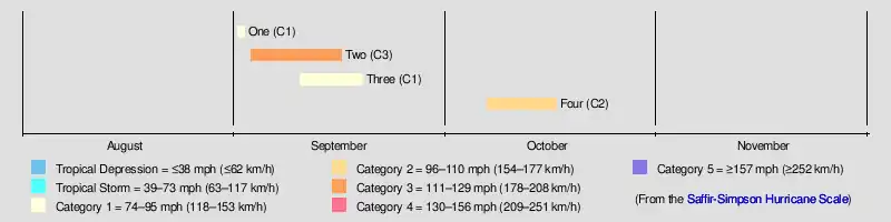 At 12:00 UTC on September 7, the storm attained its peak intensity with maximum sustained winds of 115 mph (185 km/h) and a minimum barometric pressure of 957 mbar (28.3 inHg). Early the following day, the system weakened to a Category 2 hurricane. Around 00:00 UTC on September 12, the storm deteriorated further to a Category 1 hurricane. The next day, the hurricane began accelerating to the northeast.[3] The steamship Marseille encountered the storm on September 14 and suffered damage.[4] By midday on September 15, the hurricane weakened to a tropical storm and dissipated late on September 16, while located about 575 mi (925 km) west-southwest of Ireland.[3]