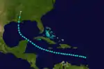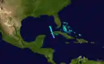 After no activity for over two months, the barque Aspatogan encountered "very heavy weather" associated with a tropical storm in the eastern Caribbean Sea on August 18.[3] The system moved west-northwestward across the Caribbean Sea and strengthened slowly. Early on August 24, the storm attained its maximum sustained winds of 60 mph (95 km/h), while situated about 80 miles (130 km) south-southwest of Grand Cayman. Re-curving northwestward, it brushed the Yucatan Peninsula on August 25, shortly before entering the Gulf of Mexico. The storm again re-curved northward while located in the central Gulf of Mexico. At 1600 UTC, it made landfall near Dulac, Louisiana with winds of 60 mph (95 km/h). The system quickly weakened to a tropical depression and dissipated over northern Mississippi on August 28.[2]
