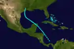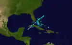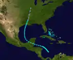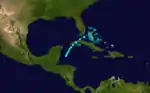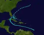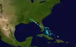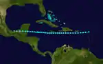 A tropical storm with winds of 60 mph (95 km/h) was first observed near Barbuda early on October 27.[11][2] The storm moved almost due west, passing through the northern Leeward Islands and then just south of Puerto Rico, Hispaniola, and Jamaica before making landfall at Ambergris Caye, British Honduras, with winds of 50 mph (85 km/h) on November 3. The system weakened as it continued westward over Mexico and dissipated on the following day near Coatzacoalcos, Veracruz.[2] Partagás and Diaz noted that "Very little information was found about this storm" and expressed "skepticism regarding the existence and evolution of this storm".[11]