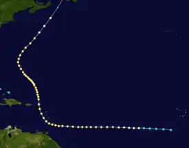 Ships first indicated the presence of a tropical storm southwest of Cabo Verde on September 5.[1] The system moved generally westward and intensified into a hurricane late the next day. Early on September 11, the storm peaked as a strong Category 2 hurricane with maximum sustained winds of 110 mph (175 km/h) as it began passing through the Lesser Antilles, first near Barbados and then between Saint Lucia and Saint Vincent several hours later. Thereafter, the hurricane turned northwestward and entered the Caribbean. Around 18:00 UTC on September 12, the cyclone passed just west of Anguilla while traversing the Anegada Passage and re-emerged into the Atlantic. The storm continued northwestward until curving northeastward on September 17. Late on September 19, the system transitioned into an extratropical cyclone about 95 mi (155 km) of the eastern tip of Nova Scotia. The remnants crossed Newfoundland before dissipating over the Labrador Sea on the following day.[2]