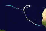 Ship reports indicates that a tropical storm developed on September 8 at 1200 UTC, while located about 175 mi (282 km) east of the Bissagos Islands, Guinea-Bissau. The storm gradually strengthened as it was heading west-northward. By late on September 9, the system strengthened into a hurricane. It passed southwest of Cape Verde on the following day. The storm then intensified slowly, becoming a Category 2 hurricane early on September 12. Around that time, the hurricane peaked with maximum sustained winds of 100 mph (160 km/h). Later on September 12, it re-curved north-northwestward. After turning north-northeast, the storm began executing a small cyclonic loop on September 14.[4]