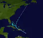 Early on August 27, a ship encountered the first tropical storm of the season, while located about 1,160 mi (1,865 km) east of the southernmost islands of Cape Verde. It slowly strengthened while moving steadily west-northwestward and entered the northeastern Caribbean on August 30. The storm moved south of Puerto Rico and made landfall in Dominican Republic as a weak tropical storm on September 2. It weakened slightly while crossing Hispaniola, before re-emerging into the Caribbean Sea later that day. On September 3, the cyclone struck modern day Santiago de Cuba Province and then slowly drifted along the southern coast of Cuba. Upon reaching the Gulf of Mexico on September 6, the storm strengthened into a hurricane, while situated near Dry Tortugas.[4]