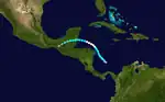 Based on observations and continuity,[1] it is estimated that a tropical depression developed in the southwestern Caribbean Sea about 120 mi (195 km) east-southeast of Isla de Providencia at 00:00 UTC on September 28. Moving slowly northwestward, the depression intensified into a tropical storm about 24 hours later.[4] Early on October 1, based on observations from the steamship Ellis, the cyclone strengthened into a hurricane.[1] Shortly thereafter, the storm began curving west-northward and peaked with maximum sustained winds of 80 mph (130 km/h). However, it soon began to weakened and fell to tropical storm early on October 2. Around 06:00 UTC on the following day, the system made landfall near the Belize–Mexico border with winds of 60 mph (95 km/h).[4] Observations from Mexico suggest that the cyclone weakened to a tropical depression around 00:00 UTC on October 4 and dissipated over Chiapas about 18 hours later.[1][4]