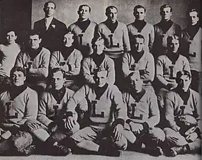 Lally and Fenton had both previously played for Mansfield Normal School,[3] and Lally was one of the best blockers for Fenton.[4][7] One of Fenton's favorite plays was the "tackle over tackle" play. In this play, Fenton faked a handoff to a back, then gave the ball to a tackle and led the blocking behind the other tackle.[8] "Doc was the hub," recalled captain and tackle Marshall 'Cap' Gandy, "and we were the spokes."[8] Fenton earned the reputation of doing everything well with a football.[7]