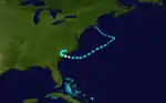 This article incorporates text from this source, which is in the public domain. - ↑ James E. Hudgins (April 2000). Tropical cyclones affecting North Carolina since 1586: An historical perspective (PDF). National Weather Service (Report). Blacksburg, Virginia: National Oceanic and Atmospheric Administration. p. 25. Retrieved September 3, 2015.