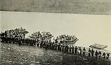 In November 1914, a branch of the Special Organization was organized in Diyarbekir.[18] The situation worsened over the winter of 1914–1915 as the Saint Ephraim church was vandalized and four young men from the Syriac village of Qarabash were hanged on charges of desertion. Two were hanged in Diyarbekir city on 18 February, observed by Special Organization operative Ömer Naji and governor Hamid Bey. The day previously, Hamid had resigned or been forced to resign. Syriacs who gathered to protest the execution were clubbed by gendarmes and two died as a result.[19][20] In March, many non-Muslim soldiers were disarmed and transferred to labor battalions where they were put to work building roads. Harsh conditions, mistreatment, and individual murders led to many deaths.[21]